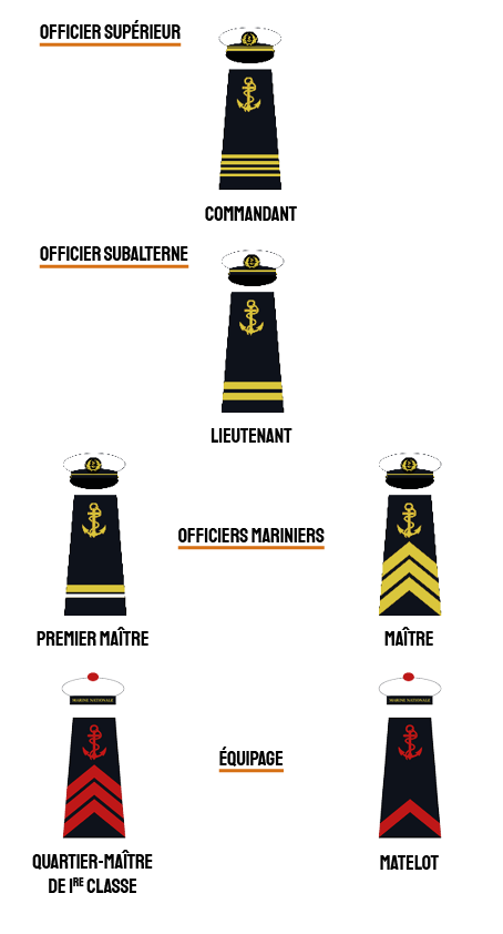 Les élèves doivent replacer 7 grades sur une échelle pyramidale. En haut, le commandant puis le maitre principal. Au milieu le second maitre et le quartier-maître. En bas les 3 membres d’équipage. Ils peuvent s’aider en allant sur le site de la Marine Nationale.