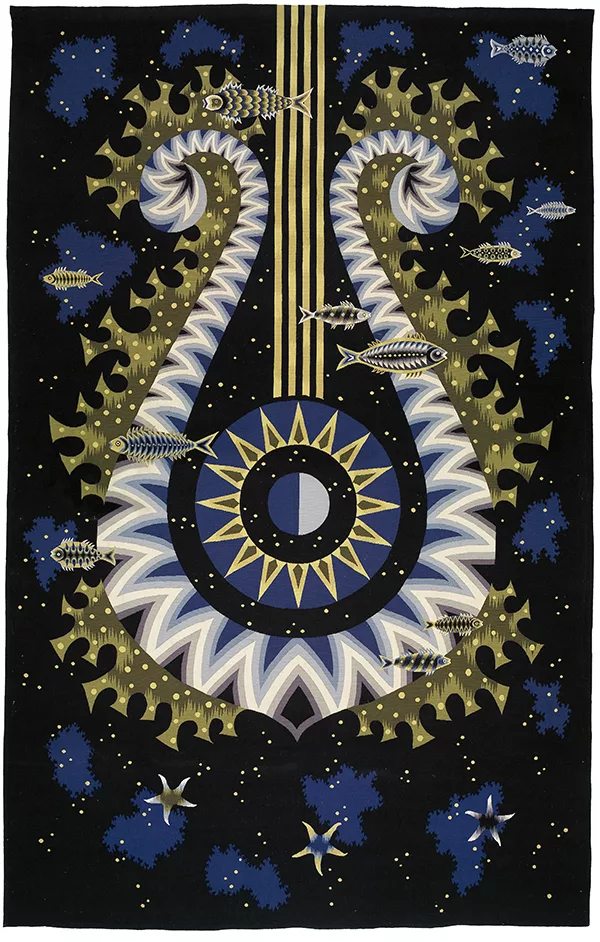 Pour l’une des deux tapisseries, des poissons stylisés et des étoiles de mers matérialisent l’eau, un des quatre éléments fondateurs. Les coraux autour de la lyre confortent cette symbolique du monde marin. Sur la deuxième tapisserie, des oiseaux suggèrent l’air, autre élément fondateur.