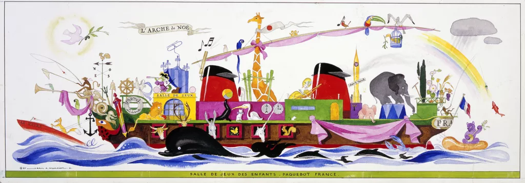Pour la décoration de la salle de jeux des enfants en classe Touriste du paquebot France (1962), Jean-Adrien Mercier remplace l’Arche par ce navire, reconnaissable à ses deux cheminées à ailerons. Le fanion au cou de la girafe, avec le rond rouge, et une bouée à l’avant, portent l’inscription « French Line ». Ils permettent d’identifier la compagnie armateur : la Compagnie Générale Transatlantique. Les animaux dessinés, réels ou imaginaires, figurent de joyeux passagers.