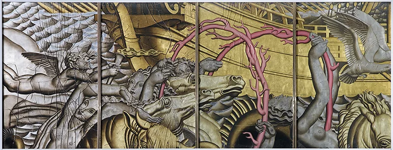 La tête de taureau de Zeus se voit au premier plan en bas à droite de ce fragment de l’œuvre originale. Sur son dos, la tête et le haut du buste d’Europe apparaissent. Un décor peuplé d’animaux réels, mouettes et coraux, et irréels, chevaux marins, entoure les deux personnages principaux. À l’arrière-plan, Jean Dupas aborde une autre thématique : la navigation, avec un navire à coque en bois propulsé à la rame et à la voile. Il met ainsi en relation l’histoire maritime et l’imaginaire.