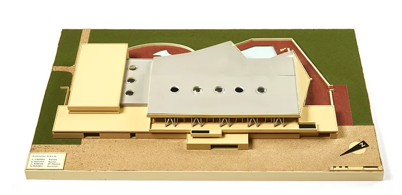 Cette maquette de concours est une proposition. Un code couleur identifie chaque élément : parties techniques et administratives en jaune, praticables en rouge, espaces verts en vert et bassins en bleu. L’architecture est moderne : toit en forme de vagues stylisées, volumes simples jouant sur les superpositions, façade vitrée avec piliers. Ce projet n’est pas retenu mais il inspire la proposition finale pour le bassin intérieur.