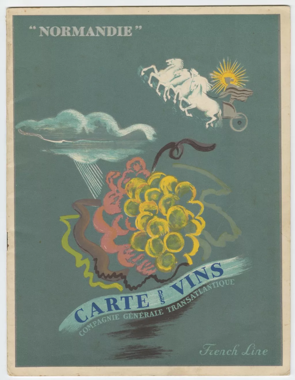 Riche de plus de 210 vins avec, notamment, une sélection de 59 champagnes différents, la carte des vins de première classe du paquebot Normandie (1935) est à la hauteur du prestige du navire.