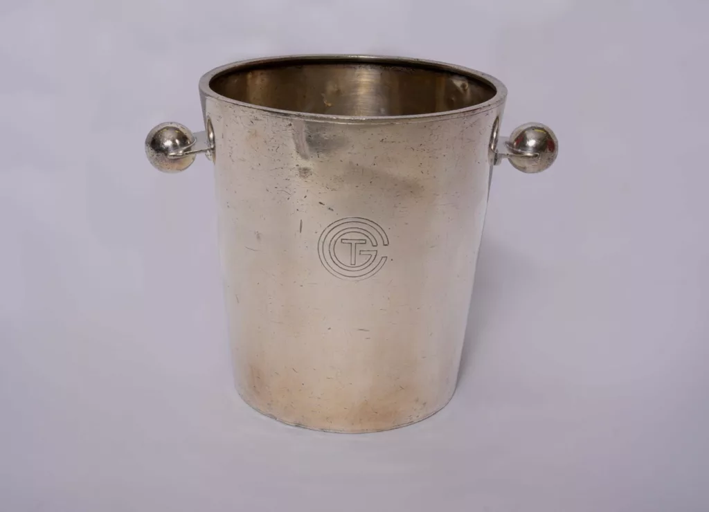 Pour l’armement de Normandie, la manufacture Christofle assure la livraison de 45 000 pièces d’orfèvrerie. Certaines d’entre elles sont spécifiquement dédiées au service du vin. L’élégance du seau à rafraîchir témoigne des talents de l’artiste : la pureté des lignes sphériques et la singularité des poignées en forme de boule se conjuguent à merveille avec le délicat monogramme circulaire de la compagnie qui orne, en façade, la pièce d’orfèvrerie.