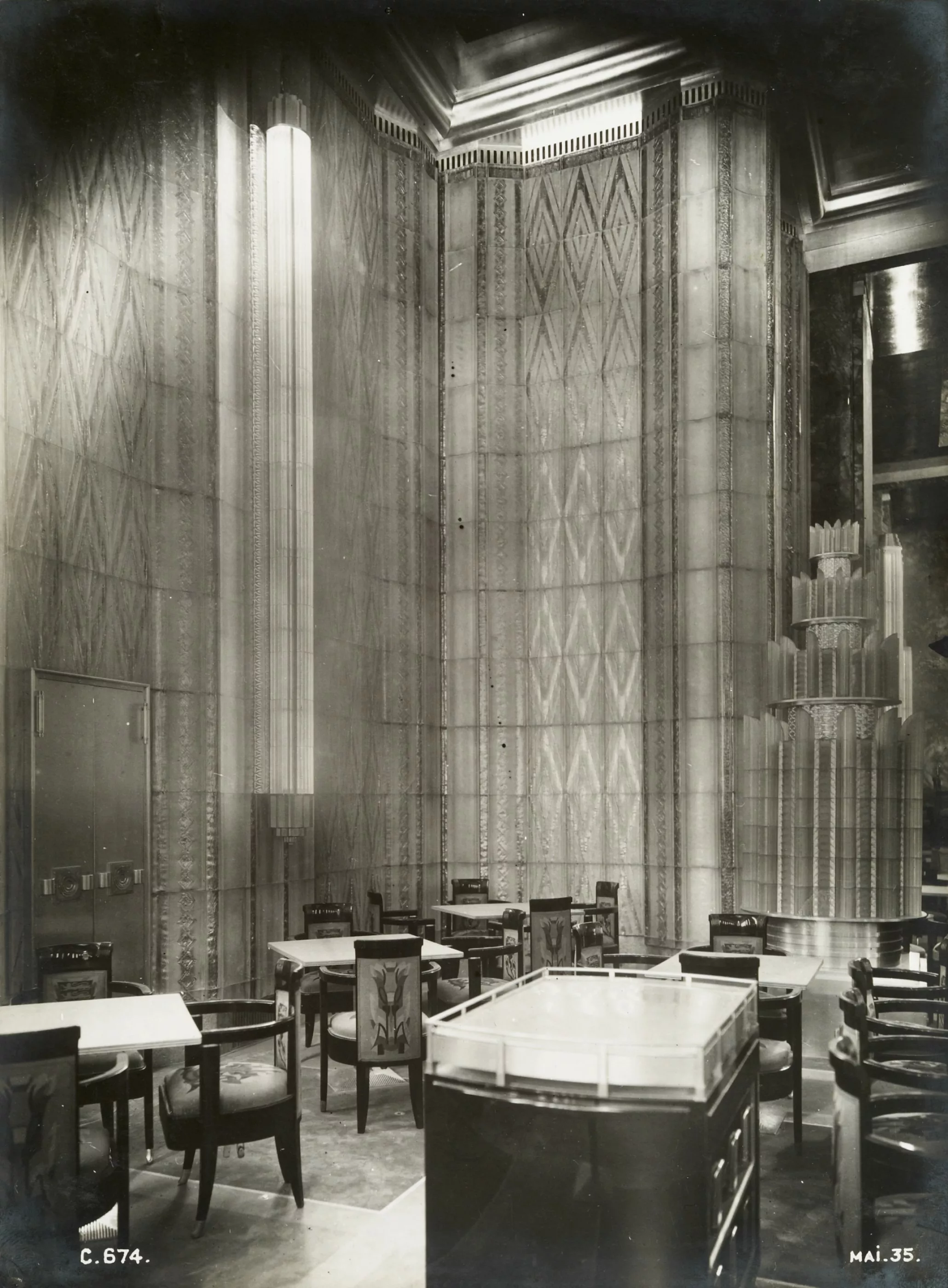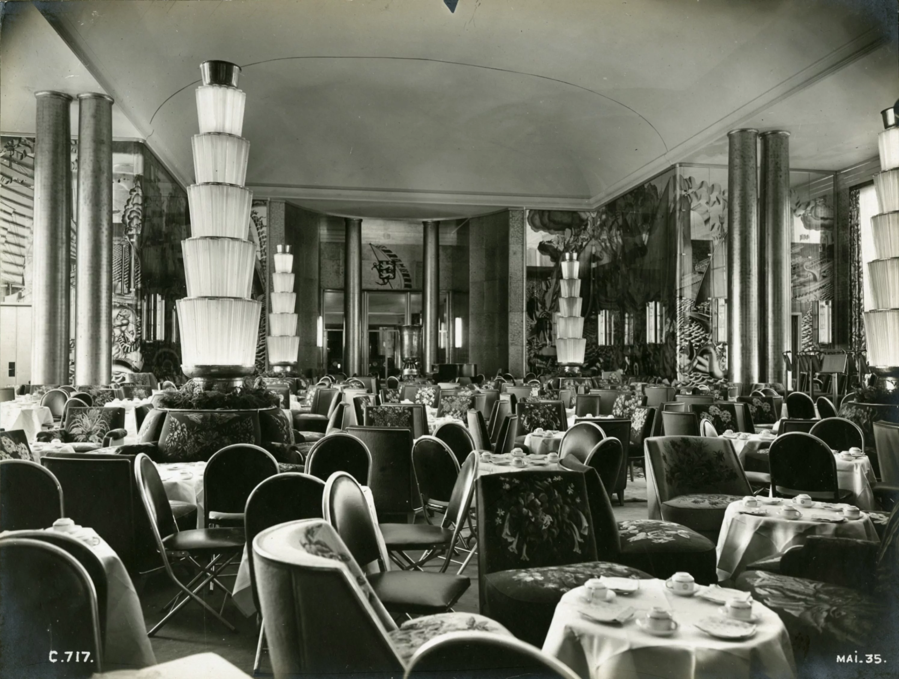 Le regard posé par l’artiste sur la chapelle du paquebot témoigne de l’attention portée par les architectes Pierre Patout et Henri Pacon pour l’éclairage de cet espace : il renforce l’intimité du lieu et tranche avec le marbre sombre. Dans un autre registre, la salle de spectacle offre une ambiance scénique et festive, soulignée par le même travail du clair-obscur.