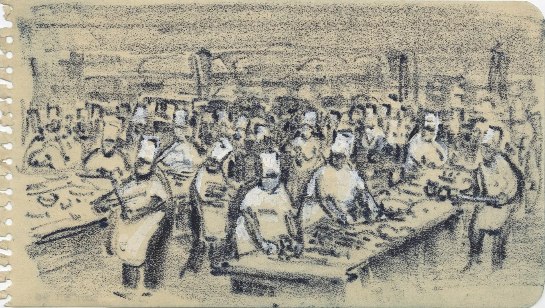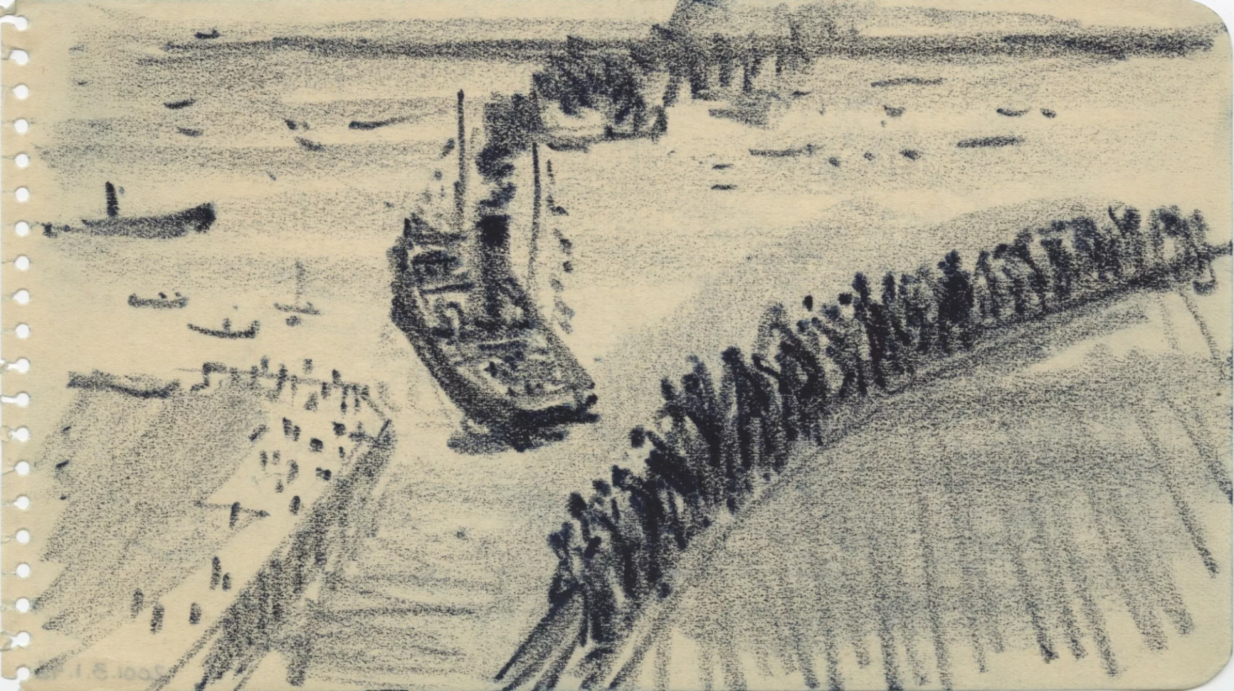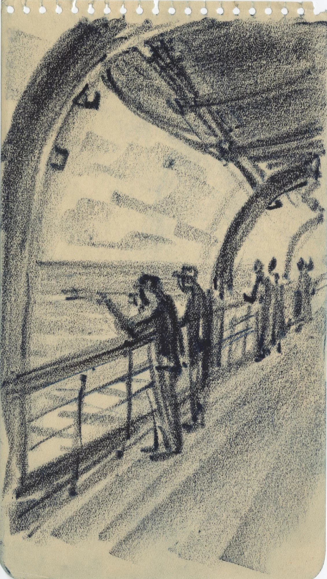 Présent parmi les passagers, sur invitation de la compagnie, Labouret saisit sur le vif ambiance portuaire, emménagements intérieurs et scènes de vie à bord du géant des mers. Dans ses carnets de voyage, les croquis deviennent de véritables instantanés souvenirs : ils retracent le récit inédit et sensible d’une traversée exceptionnelle.