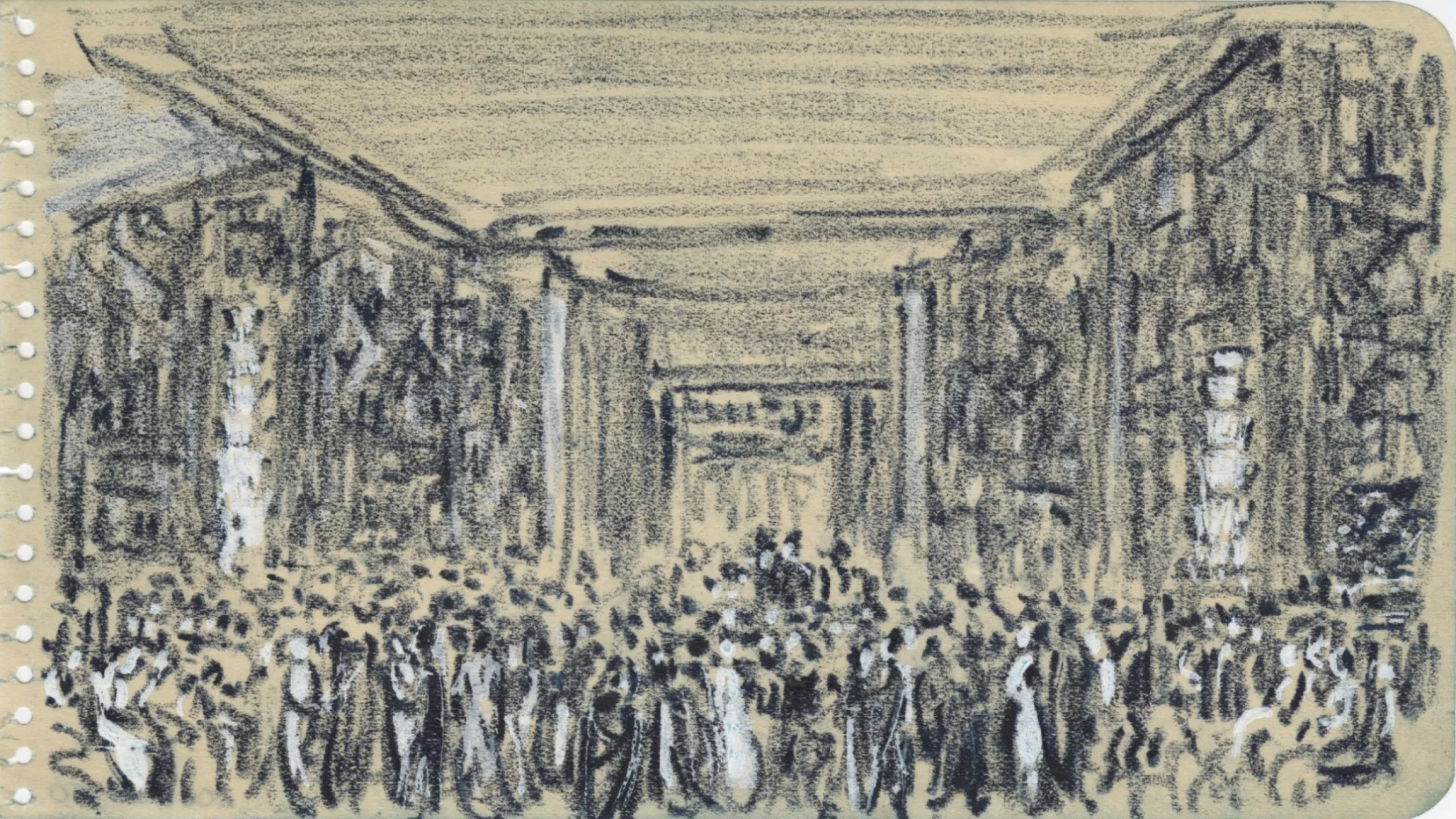 Le trait d’Auguste Labouret est vif, épuré. Il suggère le mouvement, l’effervescence, presque le bourdonnement d’une ruche dans cette « ville flottante ».