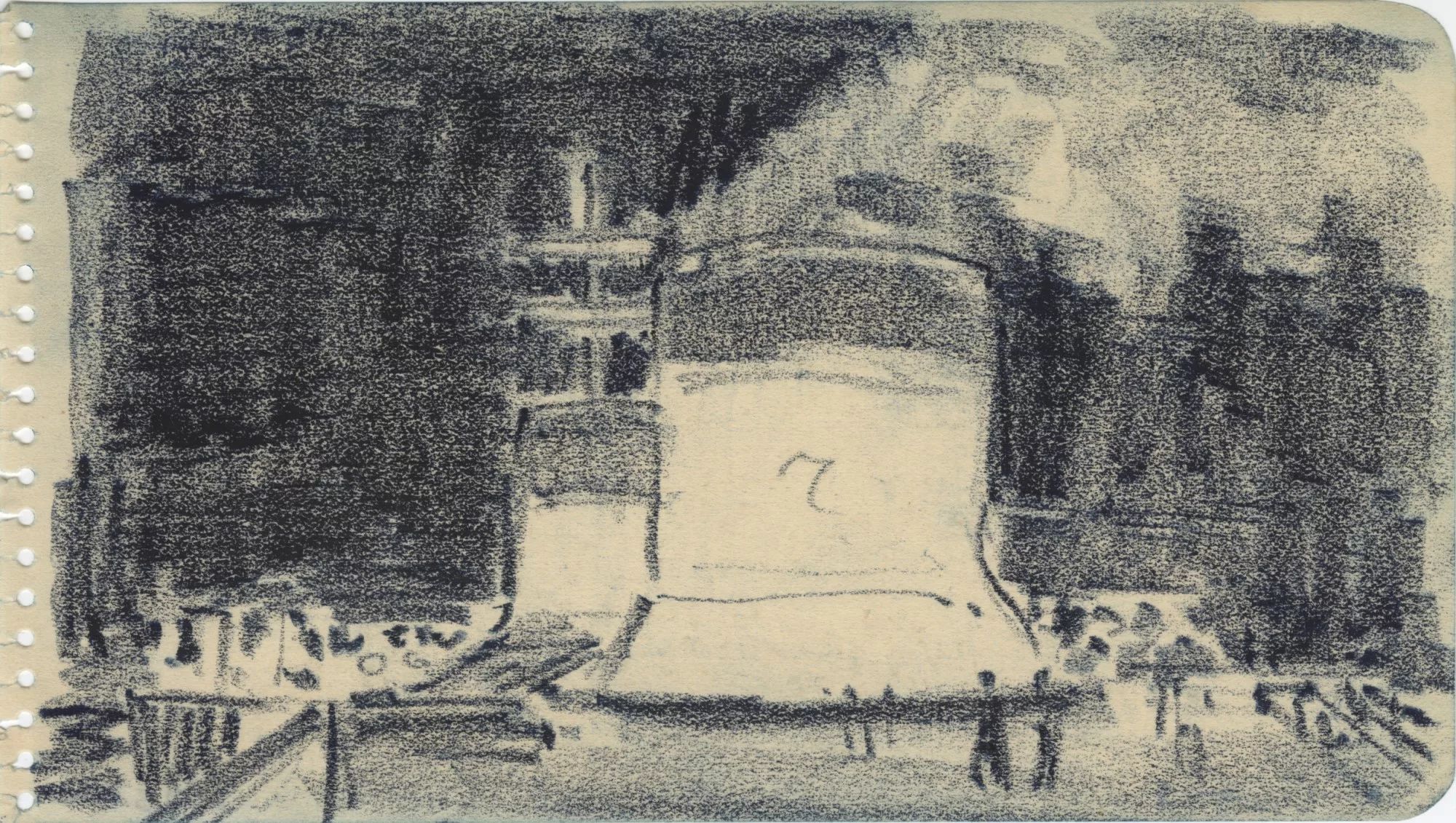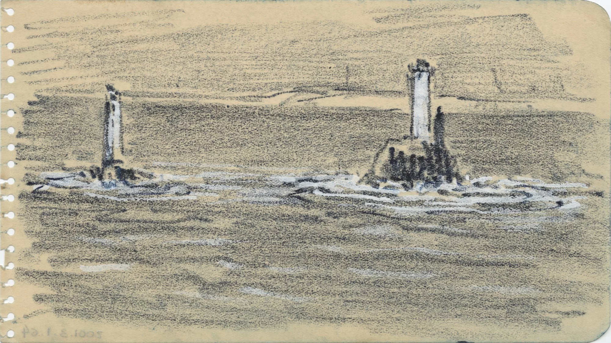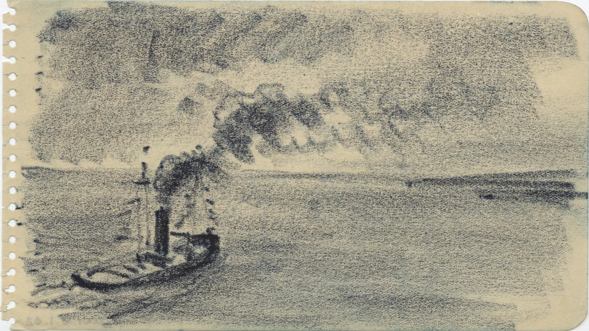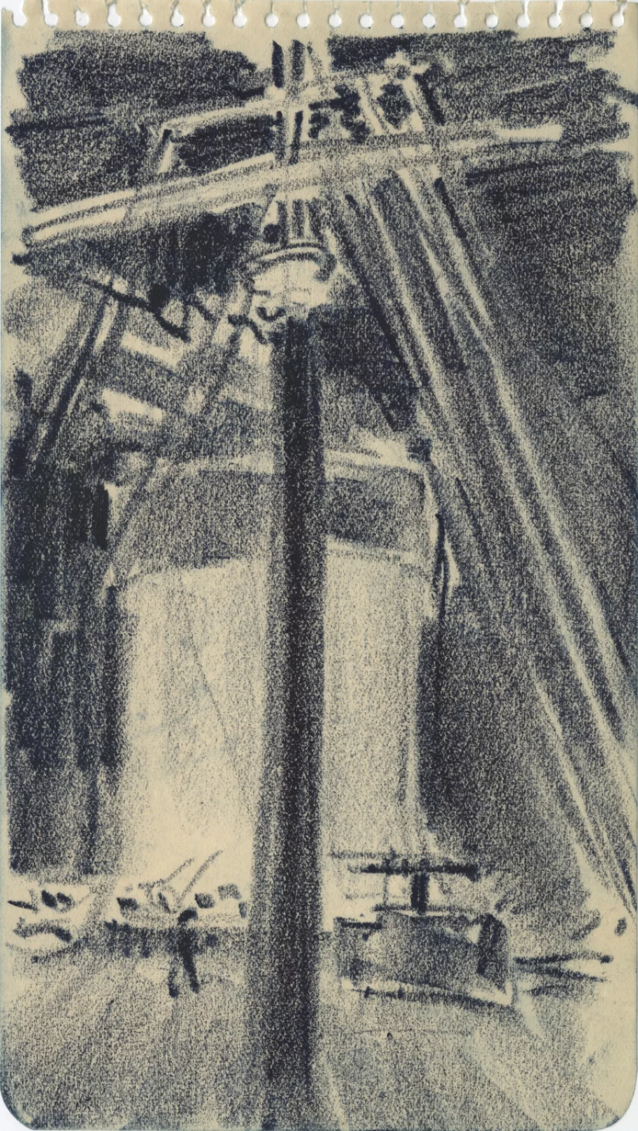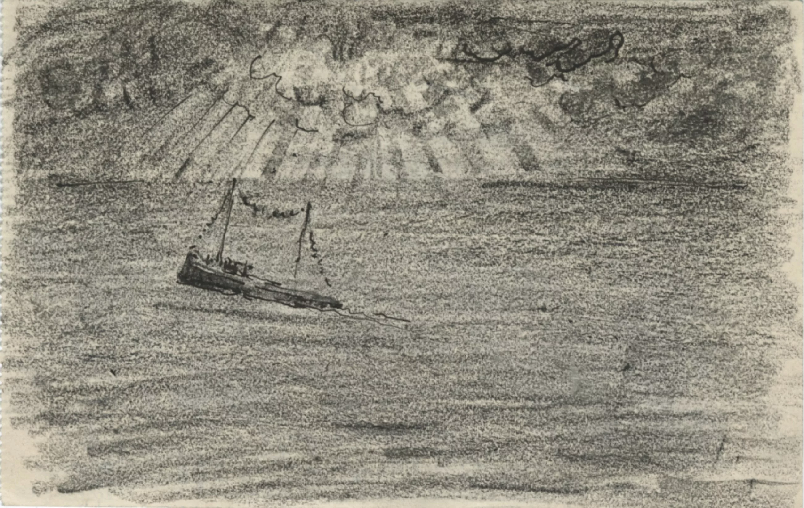 Le maître-verrier, spécialiste du vitrail, excelle dans les jeux de lumière. Rien d’étonnant, donc, à retrouver ce sens du contraste dans ses croquis. Les aplats de pastel noir, rehaussés de touches de blanc, révèlent les volumes et subliment la silhouette du navire.