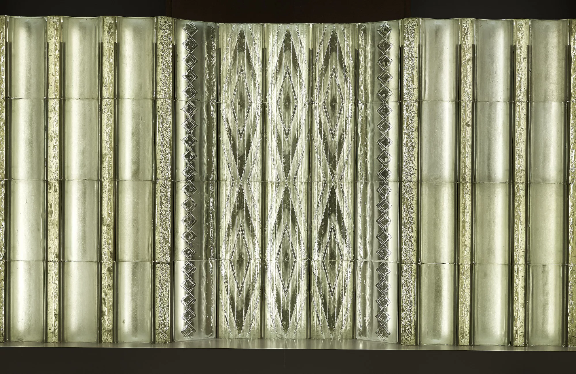 Dans ces deux espaces, il cherche à recréer l’illusion d’une lumière naturelle. Les 6 000 dalles de verre moulé qui habillent les murs de la salle à manger diffusent une chaleur discrète : elles captent la lumière pour mieux la restituer dans un subtil effet de scintillement.