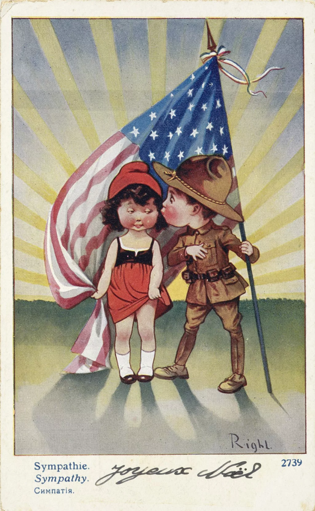 De son côté, le jeune soldat tient de la main gauche un immense « Stars and Stripes ». Drapeau officiel des États-Unis d’Amérique, il surplombe les deux enfants et s’enroule autour de la jeune fille comme une cape protectrice.