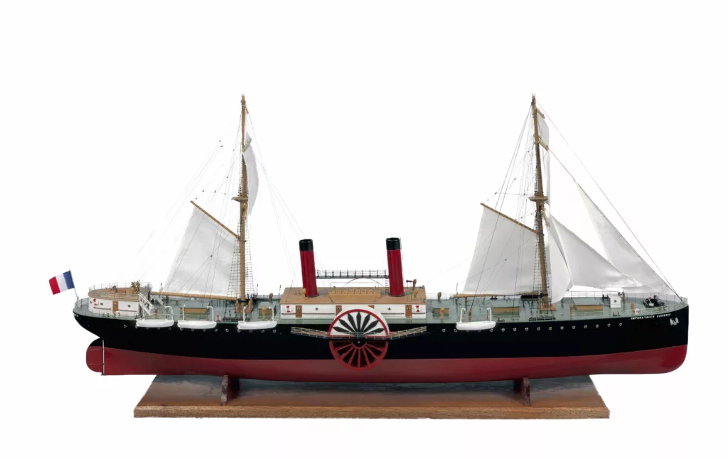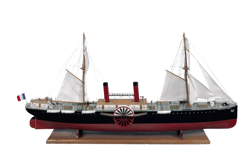 Des voiles ? Une roue à aubes ? Drôle de paquebot ! Et pourtant, voici la maquette de l'Impératrice Eugénie (1865), tout premier paquebot transatlantique construit à Saint-Nazaire.