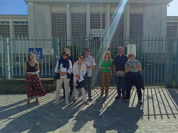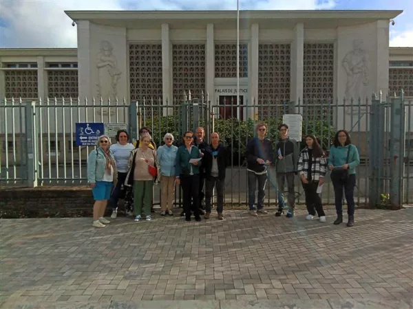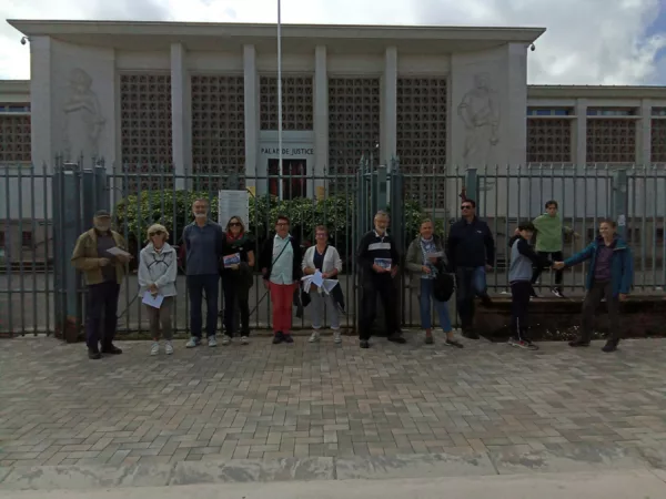 Carte postale noir et blanc du palais de justice de Saint-Nazaire, un jour de marché, vers 1900. Hommes, femmes et enfants regardent l'objectif depuis le trottoir devant le bâtiment.